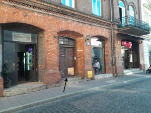 Główne wejście do budynk znajduje się pomiędzy sklepem "Bibeloty", a restauracją "Bhajan":
