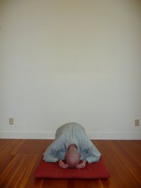 - Przesuń się do tyłu i do dołu w ten sposób, żeby Twoje pośladki dotknęły Twoich podudzi, a Twoje czoło dotknęło maty. W tej pozycji Twoje dłonie powinny być odwrócone do góry, dotykając maty obok Twoich uszu, a stopy powinny być skrzyżowane (lewa stopa na prawej).